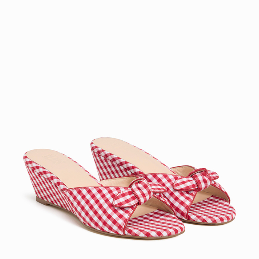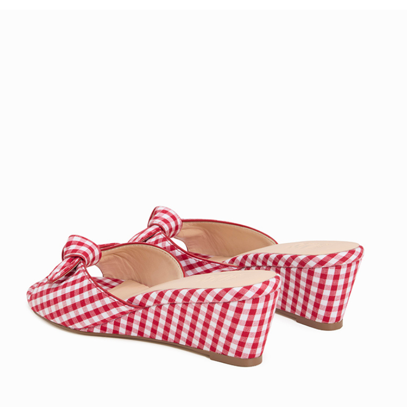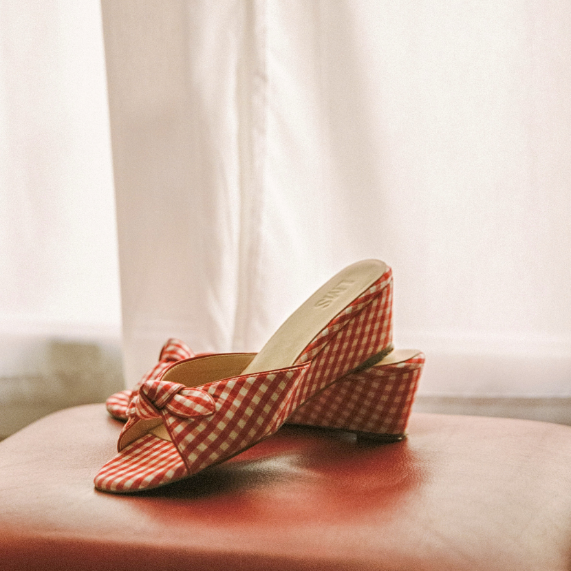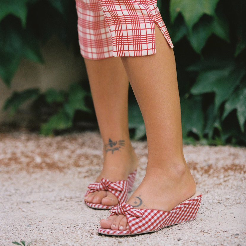Designed to capture the ease of slow Parisian mornings with her gingham fabrication, The Ellie embodies effortless femininity through its soft knot detail and sculpted wedge. A rubber sole ensures comfort and longevity, made for coffee to cocktails.