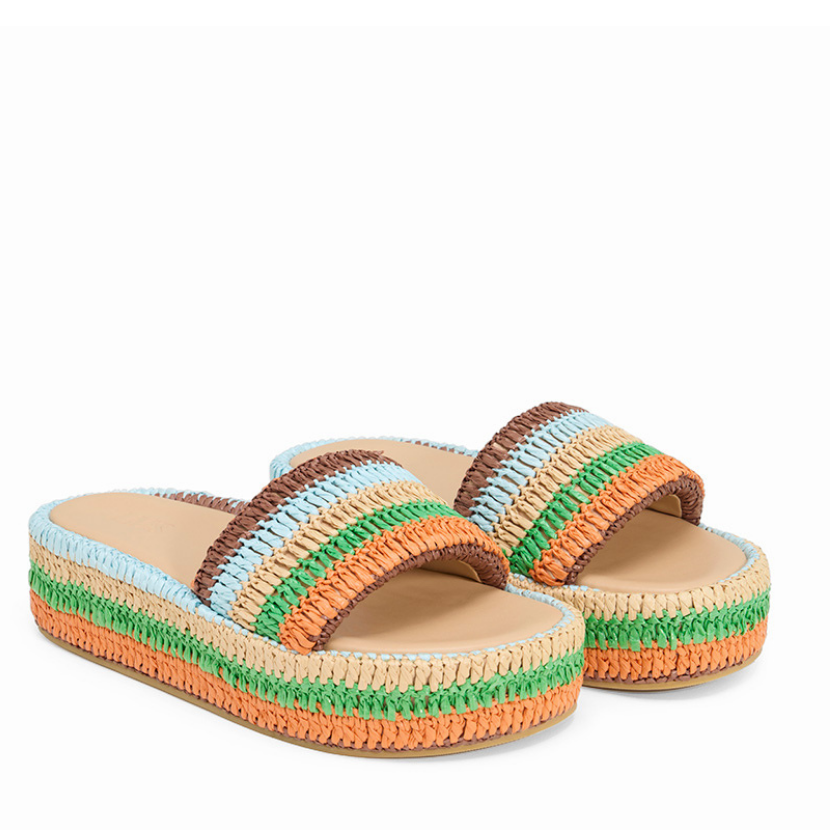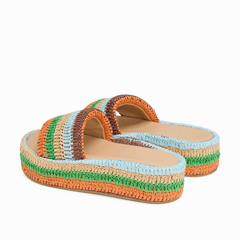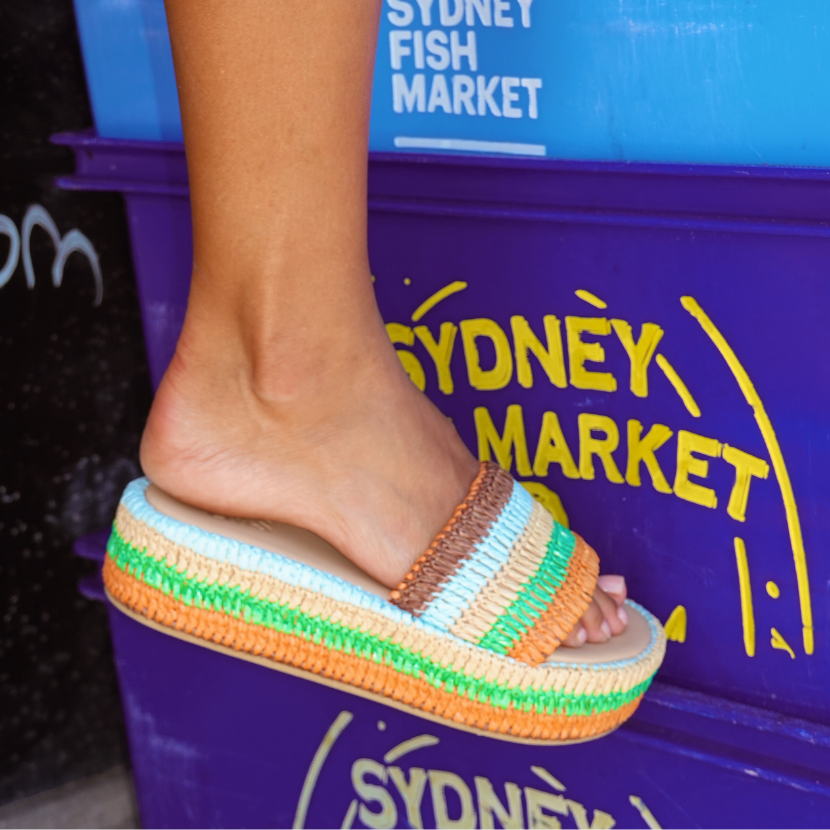 Embody your favourite rom-com IT girl and slip into the ultimate Summer flatform slide. Showcasing a woven raffia material & thick strap, The Mary will quickly transform your outfit from standard to statement with its vibrant and playful colour palette. Everyone will see you in The Mary and want them too! To add to the ultimate IT girl factor, The Mary is vegan friendly too.